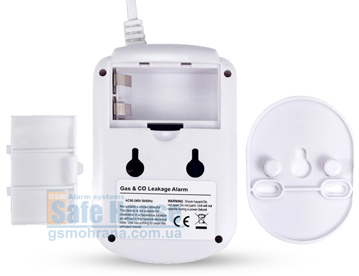 Гибридный датчик природного и угарного газа CO-799 легко закрепить на стене, главное чтобы рядом была электророзетка т.к. основное питание датчика от сети ~220В. А для того чтобы датчик CO-799 мог продолжать работать при отключении электроэнергии у него предусмотрен отсек для установки перезаряжаемого 9-тивольтового аккумулятора типа «Крона». Поэтому для стабильной работы рекомендуем подключить датчик к сети ~220В и установить в него аккумулятор.