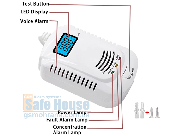Гибридный датчик природного и угарного газа CO-799 оснащен громкой встроенной сиреной мощностью 85 дБ. На передней панели датчика имеется информационный LCD-дисплей с подсветкой, который выводит показания значений загазованности воздуха и три цветных индикатора, которые отображают режим работы датчика состояние его питания и наличие неисправности. Функция автоматического самотестирования вовремя обнаружит неправильную работу датчика и сразу оповестит вас об этом голосовым сообщением. А чтобы самостоятельно проверить работоспособность датчика вы можете в любой момент нажать кнопку «PUSH TO TEST».