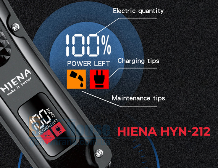 Машинка Hiena HYN-212 може працювати як від мережі, так і вбудованого акумулятора, що робить її універсальним інструментом для повсякденного використання. Повна зарядка займає близько 90 хвилин, після чого пристрій здатний працювати до 180 хвилин без заряджання. LED-дисплей відображає рівень заряду акумулятора, що дозволяє контролювати час роботи пристрою.