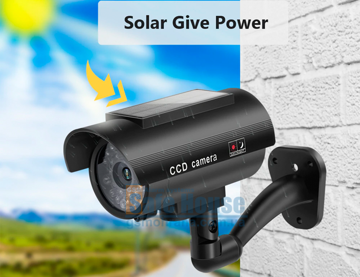 Купити муляж вуличної камери відеоспостереження із сонячною панеллю Solar Power Fakecam CCD-01, який ідеально підходить для встановлення на комерційних об’єктах, приватних домоволодіннях та громадських територіях. Для швидкого монтажу муляжу камери поставляються дюбелі з гвинтами. Муляж камери відеоспостереження із сонячною панеллю Solar Power Fakecam CCD-01 виготовлений у водонепроникному корпусі з високоякісного удароміцного ABS-пластику з поворотним кронштейном, що регулюється в усіх напрямках. Це дозволяє встановити нахил і кут муляжу так, щоб він виглядав природно як справжня камера, яка веде відеореєстрацію. Для більш переконливого вигляду ця модель Fakecam CCD-01 обладнана блимаючим світлодіодом червоного кольору в області об’єктива. Блимання світлодіода змушує думати, що ця камера відеоспостереження зараз дійсно працює і веде відеофіксацію. Світлодіод здатний блимати цілодобово. Для цього муляж камери Solar Power Fakecam CCD-01 обладнаний двома незалежними джерелами живлення: